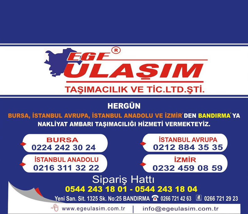 Ürünlerinizin teslim noktalarına ulaştırılmasında EGE ULAŞIM size güvenebileceğiniz bir ortaklık öneriyor. EGE ULAŞIM ; dağıtım ağı , eğitimli personeli ve modern filosuyla malzemelerinizin sevkiyatını planlar , uygun araçlarla ve uygun koşullarda istenilen minimum sürede size ve müşterilerinize ulaştırılmasını sağlar. 59 şubemizin bulunduğu hizmet ağı içerisinde 500 noktaya hizmet ulaştırmaktayız. Hergün; İstanbul'dan Balıkesir, Bandırma, Karacabey ve Mustafakemalpaşa'ya ambar, kargo, lojistik ve parsiyel yük taşımacılığımız vardır. Yine bu bölgelerden İstanbul'a karşılıklı ambar taşımacılığımız mevcuttur.
